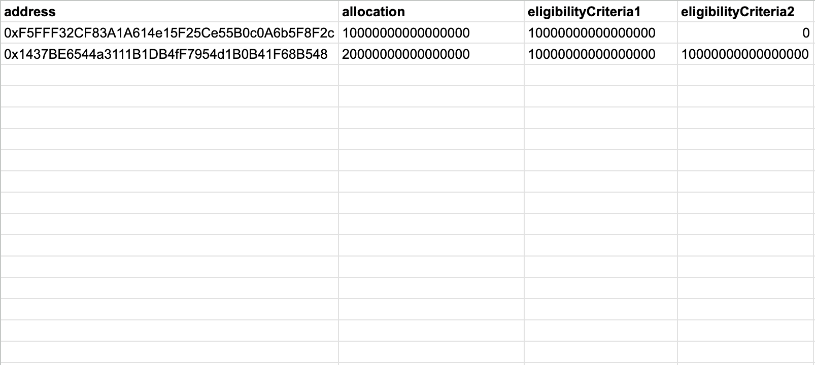 address: wallet addresses of the allowlisted addressesallocation: the total allocation for each address, denominated in the token’s decimals (i.e. 6 decimals for USDC, 18 decimals for ETH)eligibilityCriteria1,eligibilityCriteria2, etc.: breakdown of reasons for the allocation (i.e. “Pudgy Penguin NFT Holder”, “Bought boba with crypto”)